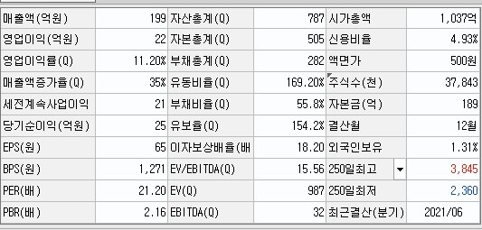 시가총액은 1,037억원, 신용비율은 4.93%, 액면가 500원, 자본금은 189억원입니다.